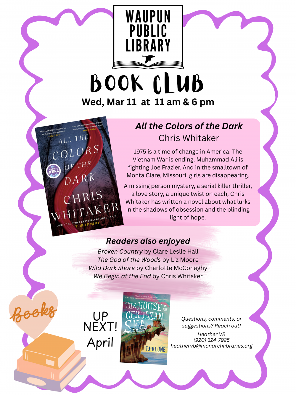 The Waupun Public Library hosts a monthly book club on the second Wednesday of each month at 11:00am or 6:00pm. If you are interested in joining book club, please call the library at 920-324-7925 or email Heather Van Buren at heathervb@monarchlibraries.org.